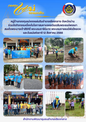 เนื่องในโอกาสมหามงคลวันเฉลิมพระชนม์พรรษา สมเด็จพระนางเจ้าสิริกิติ์ พระบรมราชินีนาถ พระบรมราชชนนีพันปีหลวง และวันแม่แห่งชาติ 12 สิงหาคม 2568 หมู่บ้านกองทุนแม่ของแผ่นดินในพื้นที่อำเภอเชียงกลาง จังหวัดน่าน ได้ร่วมกันจัดกิจกรรมเพื่อแสดงความจงรักภักดีและสำนึกในพระมหากรุณาธิคุณ พร้อมทั้งส่งเสริมการมีส่วนร่วมของคนในชุมชน ดังนี้